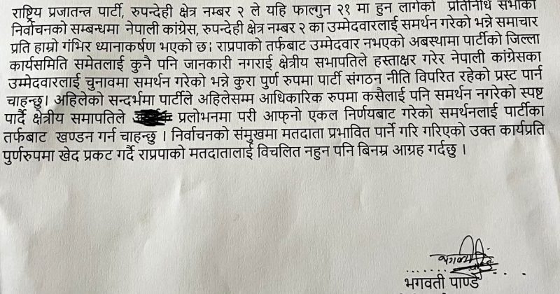रुपन्देही । राष्ट्रिय प्रजातन्त्र पार्टी (राप्रपा) मा विवाद चुलिएको छ । आइतवार क्षेत्रिय अध्यक्ष राम बहादुर थापा पार्टीको नीति...