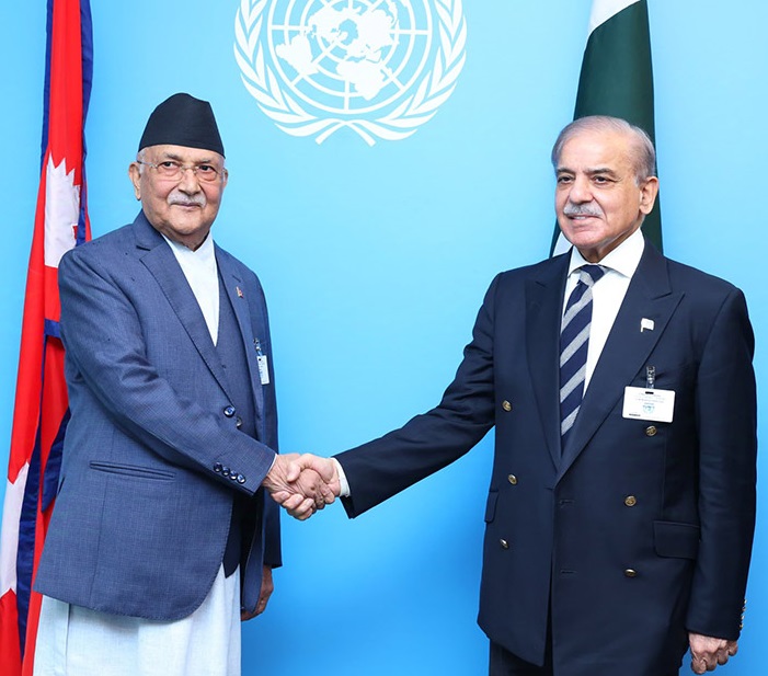काठमाडौँ । प्रधानमन्त्री केपी शर्मा ओलीले पाकिस्तानका प्रधानमन्त्री शहबाज शरिफसँग भेटवार्ता गरेका छन् । संयुक्त राष्ट्रसङ्घको ७९औँ महासभामा भाग लिन नेपाली प्रतिनिधिमण्डलको नेतृत्व गर्दै अमेरिकाको न्युयोर्कमा रहेका प्रधानमन्त्री ओलीले शाहबाजसँगको भेटमा द्विपक्षीय र बहुपक्षीय फोरममा सहयोग अभिवृद्धि गर्ने, व्यापार, लगानी, पर्यटन र सांस्कृतिक सम्बन्ध विस्तार गर्ने विषयमा छलफल गरेको सामाजिक सञ्जालमार्फत जानकारी दिएका छन् ।