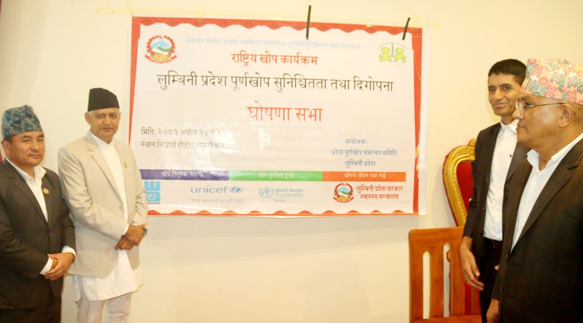 लुम्बिनी प्रदेशमा आर्थिक बर्ष २०८०र०८१ रणनीति अनुसार १६ देखि ५९ महिनाका १३० शून्य डोजका र दुई हजार तीन सय ४३ खोप लगाउन छुटेका ड्रप आउट बालबालिकालाई खोजि गरेर पूर्ण खोप लगाइएको हो । लुम्बिनी प्रदेशमा दुई लाख ६२ हजार ८ सय ५६ जना बालबालिकाले पूर्णखोप पाएको सुनिश्चित गरिएपछी पूर्णखोप सुनिश्चित प्रदेश घोषणा गरिएको हो । घोषणा कार्यक्रममा स्वास्थ्य मन्त्री खेम सारु लगायत स्थानीय तहका प्रमुख रउपप्रमुखहरुको सहभागीता थियो ।