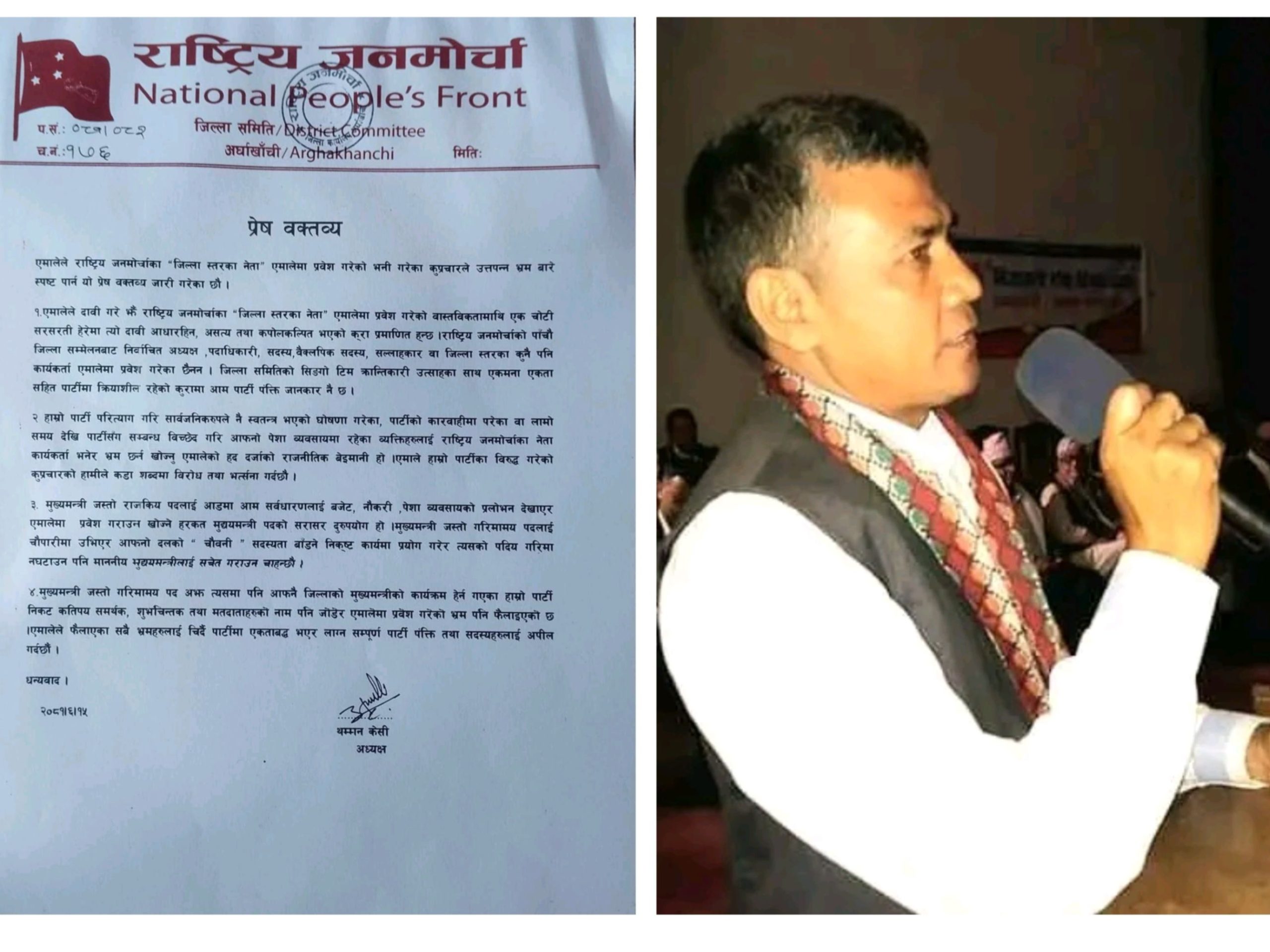 अर्घाखांची, असोज १५ गते । राष्ट्रिय जनमोर्चा अर्घाखाँचीका अध्यक्ष थम्मन केसीले प्रेसवक्तव्य जारी गरी बताएका छन् । अर्घाखाँचीमा राष्ट्रिय जनमोर्चामाथि एमालेले भ्रम फिजाएकोप्रति आपत्ती जनाउंदै कसैको भ्रममा नपर्न अध्यक्ष केसीले आग्रह गरेका छन् ।