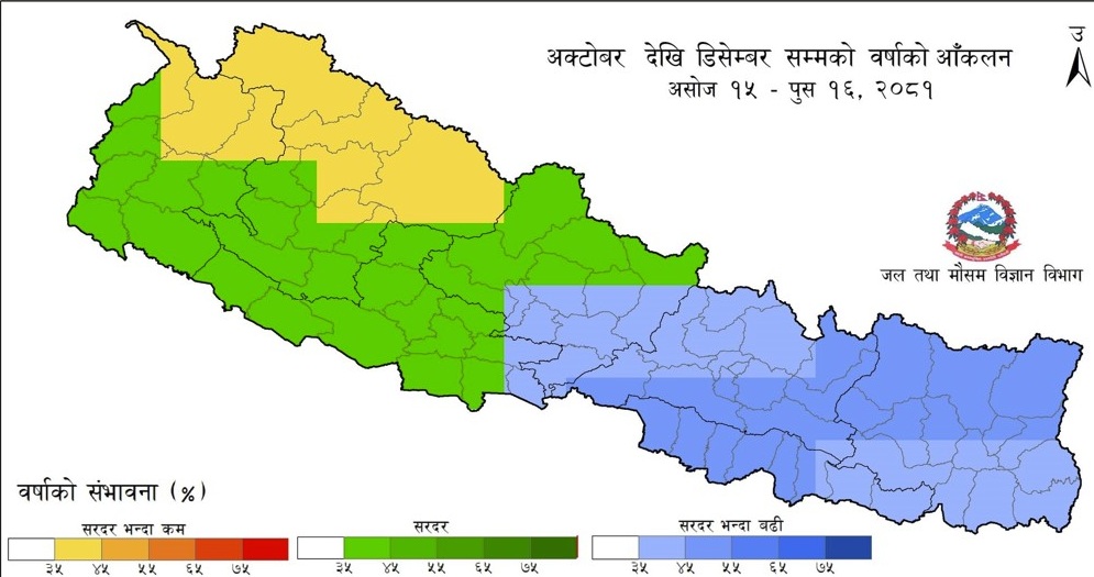 त्यसैगरी कर्णाली प्रदेशका मध्य तथा उत्तरी भाग र सुदूरपश्चिम प्रदेशका उत्तरी भागमा सरदरभन्दा कम वर्षा हुने सम्भावना ३५ देखि ४५ प्रतिशत र देशका बाँकी भागमा सरदर वर्षा हुने सम्भावना ३५ देखि ४५ प्रतिशत नै रहेको विवरणमा उल्लेख छ ।