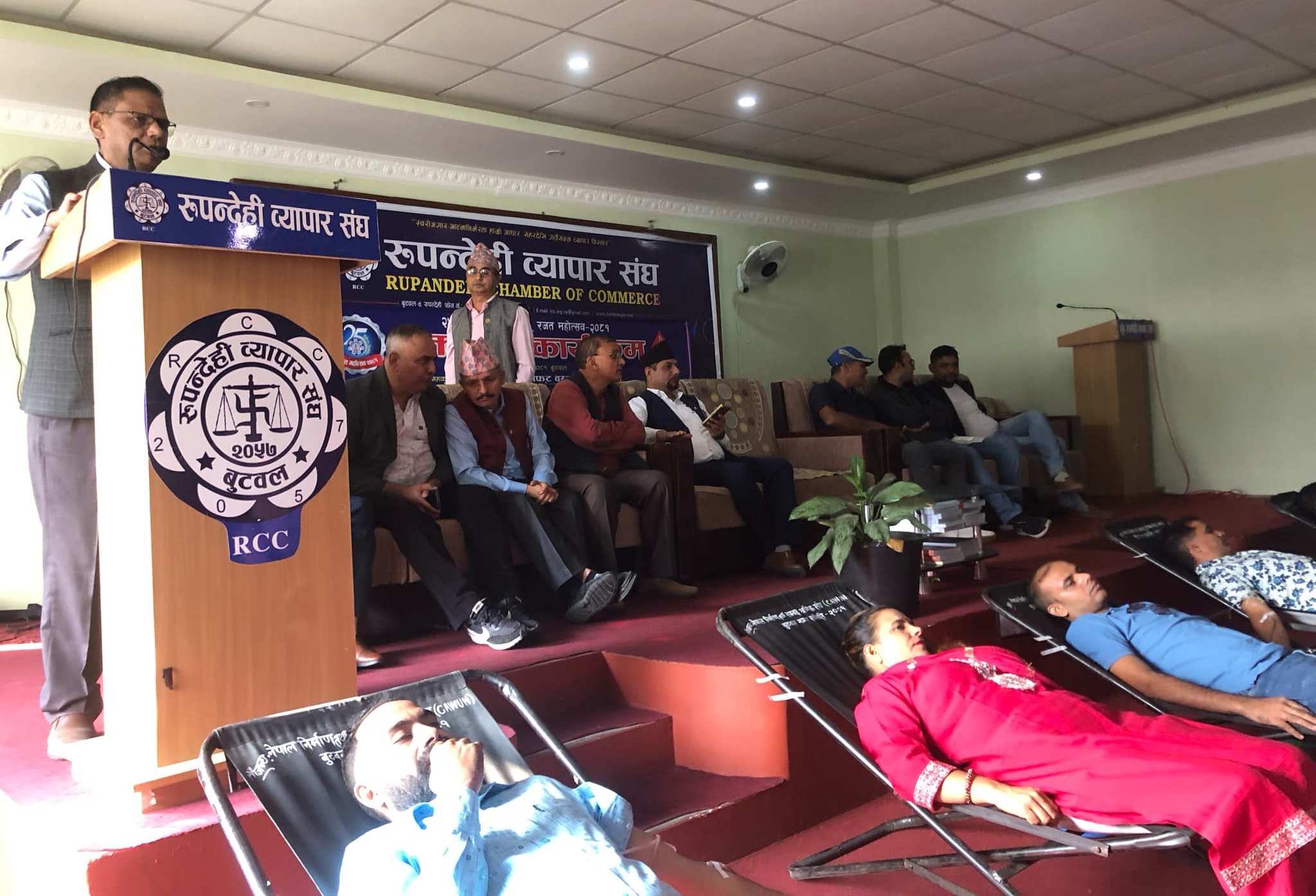 बुटवल, कार्तिक २६ गते । रुपन्देही व्यापार संघले २५ वर्ष प्रवेश गरेको अवसरमा सोमवार बुटवलमा खुल्ला रक्तदान कार्यक्रम गरेको छ । संघको सचिवालमा आयोजित कार्यक्रममा १ सय २५ युनिट सगत संकलन भएकोे कार्यक्रम संयोजक प्रकाश पौडेलले जानकारी दिए ।