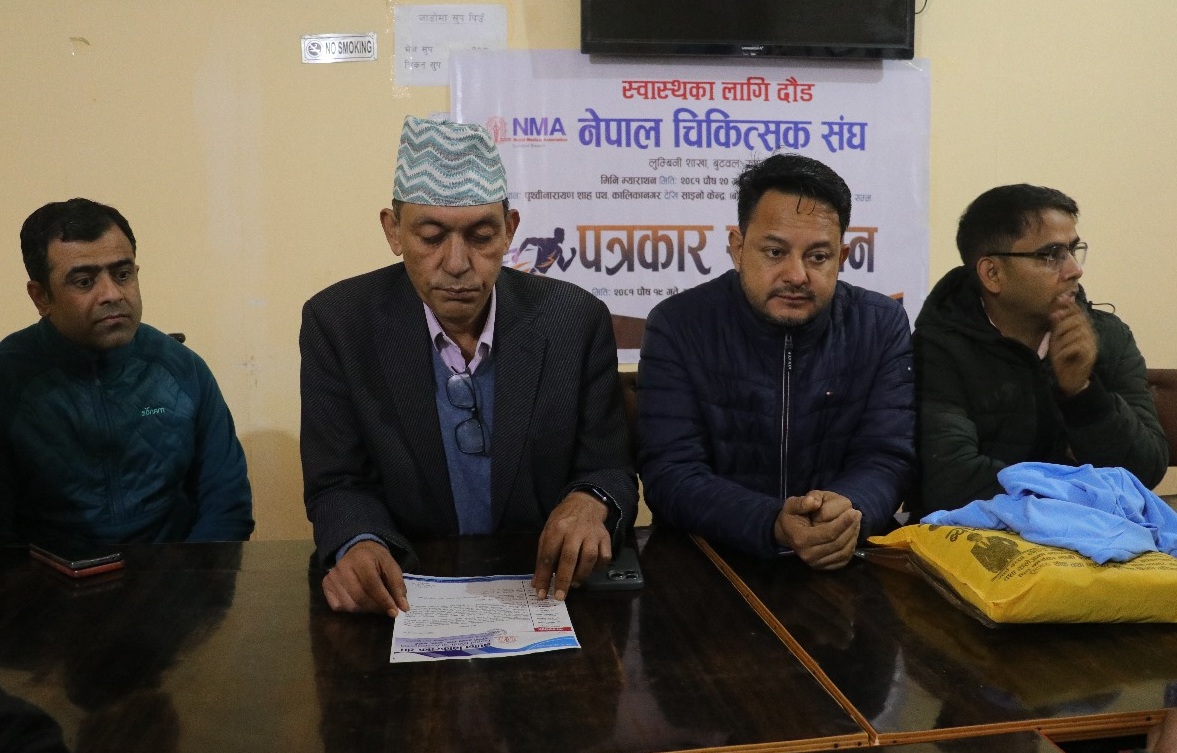 बुटवल । नेपाल चिकित्सक संघ, लुम्बिनी शाखाले शनिबार बुटवलमा दौड प्रतियोगिता गर्ने भएको छ । स्वस्थ्य सचेतना जगाउँदै रुपन्देहीभित्रका व्यावसायिक र सामाजिक संघसंस्थाहरु बिचमा सम्बन्ध विस्तार गर्ने उद्देश्य अनुसार संघले दौड गर्ने भएको हो ।