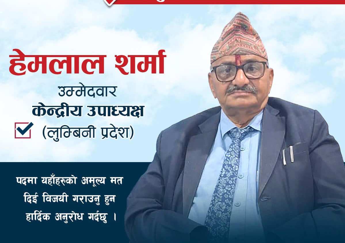 काठमाण्डौमा दुई दिनसम्म चल्ले महाधिवेशनकोे निर्वाचनमा उपाध्यक्षका लागि बुटवलका हेमलाल भुसाल शर्माले उपाध्यक्ष पदमा उम्मेदवारी घोषणा गरेका छन् ।