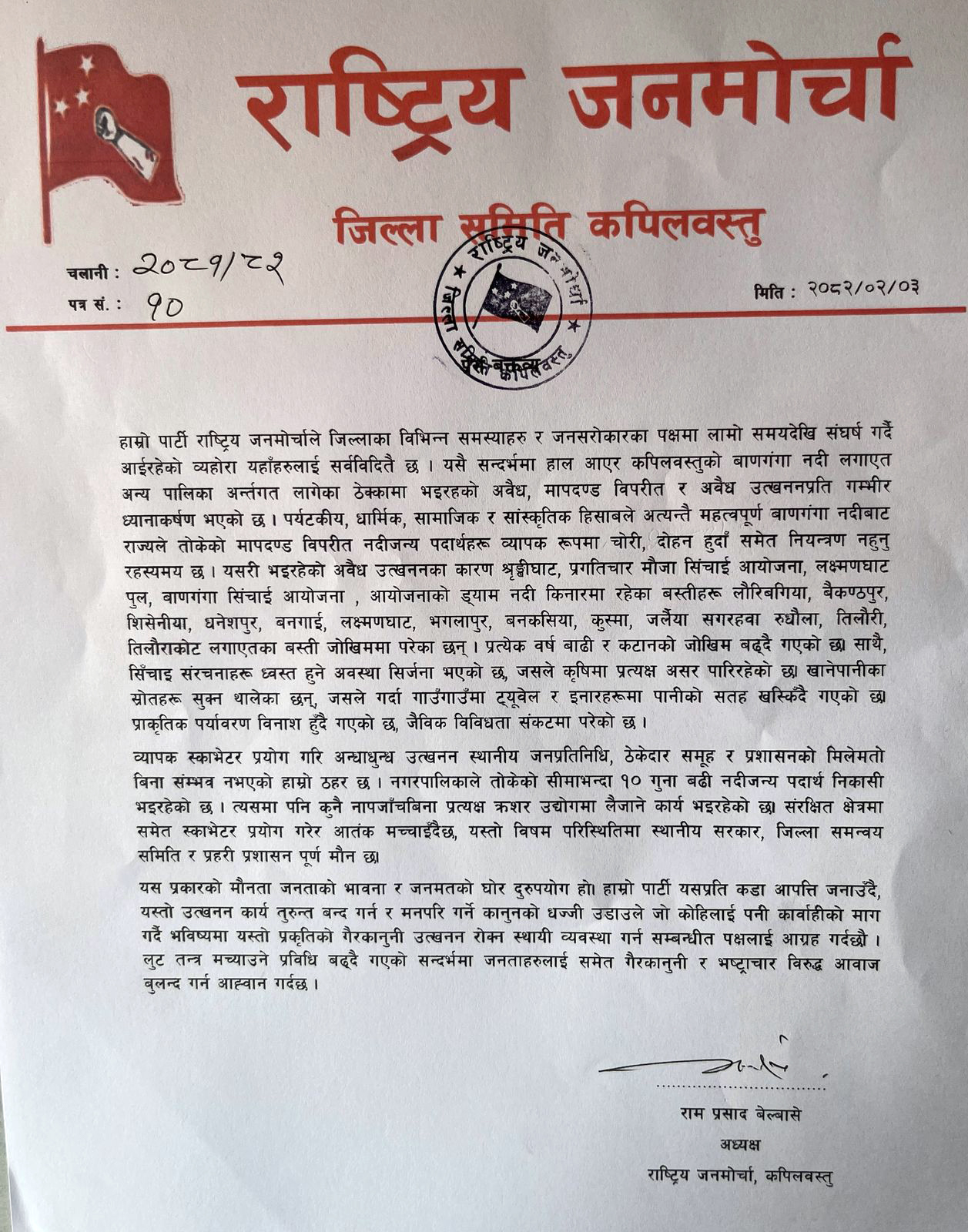 राष्ट्रिय जनमोर्चा कपिलवस्तुका अध्यक्ष रामप्रसाद बेलबासेले विज्ञप्ती निकाली अबै रुपमा उतखनन् भैरहेको नदीजन्य पदार्थ तत्काल रोक्न माग गरेका छन् । राजमोले कपिलवस्तुको बाणगंगा नदीलगायत अन्य पालिकाअन्र्तगत लागेका ठेक्कामा भइरहको अवैध, मापदण्ड विपरीत र अवैध उत्खनन्प्रति आफ्नो गम्भीर ध्यानाकर्षण भएको बताएको छ ।
