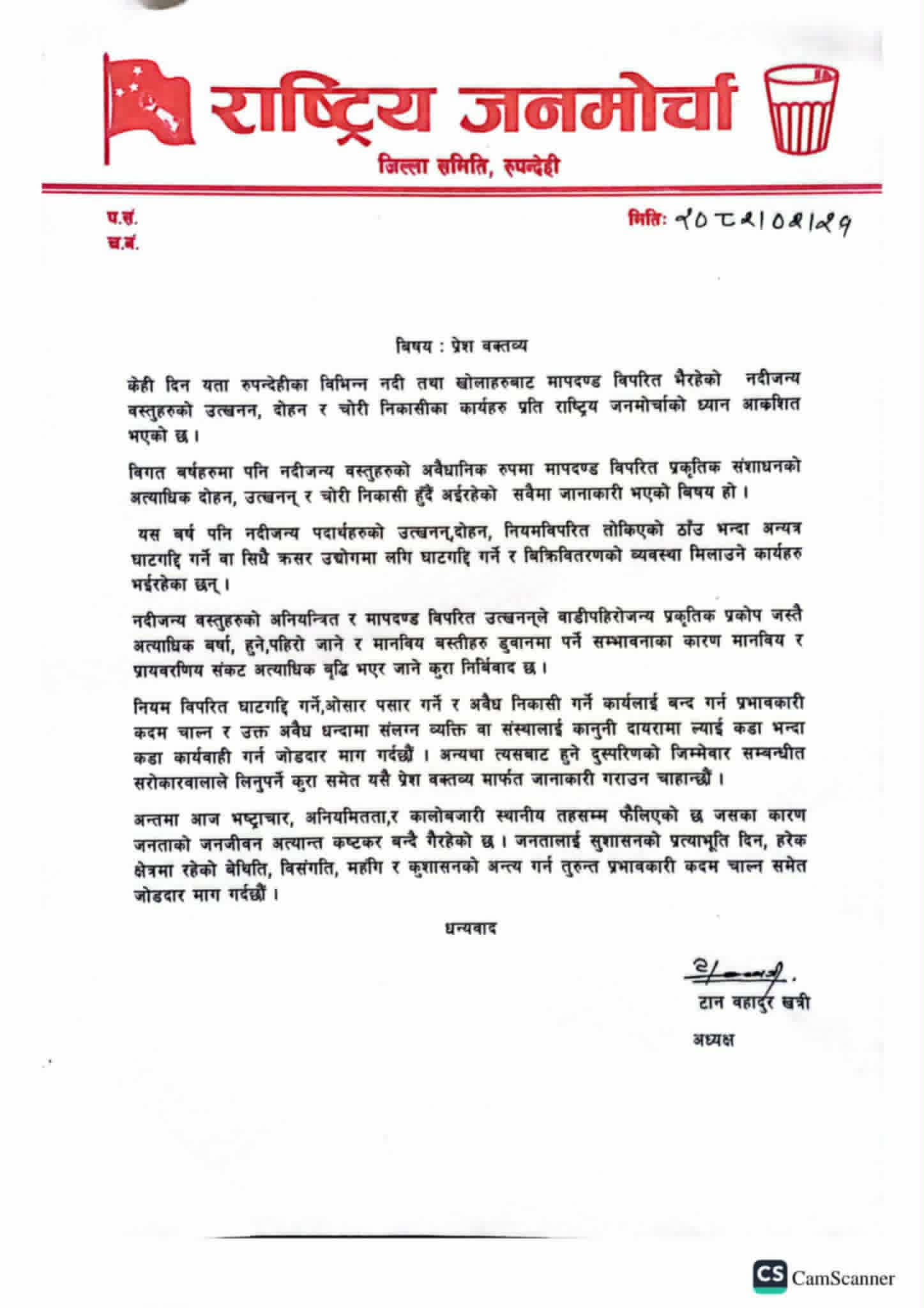 राष्ट्रिय जनमोर्चा रुपन्देही अध्यक्ष टानबहादुर खत्रीले बुधबार विज्ञप्ती जारी गरी रुपन्देहीका विभिन्न नदी तथा खोलाहरुबाट मापदण्ड विपरित भैरहेको नदीजन्य पदार्थको उत्खनन, दोहन र चोरी निकासीका कार्यप्रति ध्यान आर्कषित भएको बताएका छन् ।विगतका वर्षहरुमा जस्तै बर्ष पनि नदीजन्य पदार्थको उत्खनन्, दोहन, नियमविपरित तोकिएको ठाँउ भन्दा अन्यत्र घाटगद्दी गर्ने वा सिधै क्रसर उद्योगमा लगि घाटगद्दी गर्ने र बिक्रिवितरणको व्यवस्था मिलाउने काम गलत भएको राष्ट्रिय जनमोर्चाले बताएको छ ।