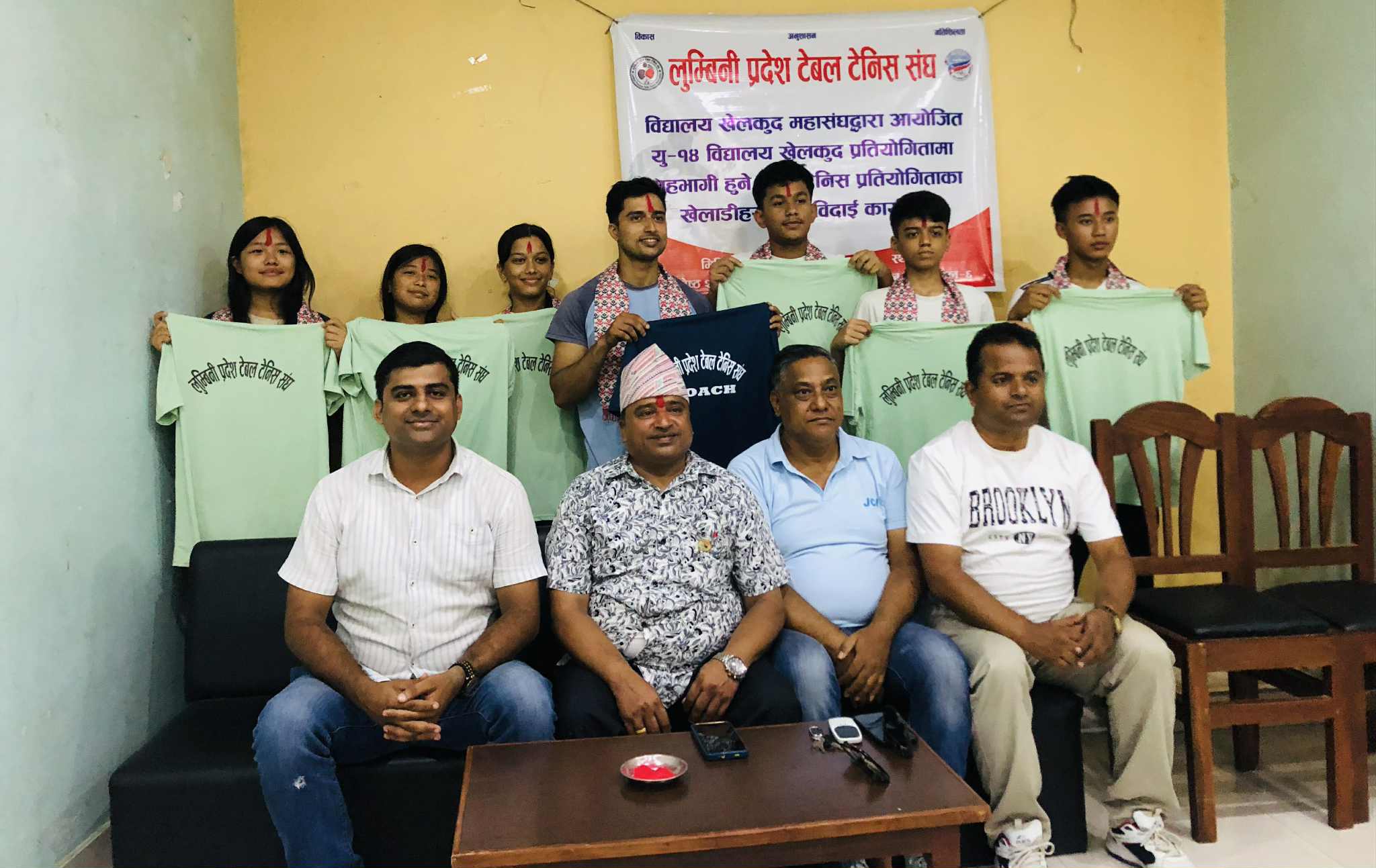 लुम्बिनी प्रदेश टेवल टेनिस संघको आयोजनामा भएको विदाई कार्यक्रममा प्रदेशबाट छनौट भएका ६ जना खेलाडीलाई खादा तथा टिर्सट प्रदान गर्दै विदाई गरिएको थियो । खेलाडीहरुलाई बुटवल उपमहानगरपालिका वडा नं. ६ का अध्यक्ष लोकनाथ न्यौपाने, लुम्बिनी प्रदेश टेवल टेनिस संघका अध्यक्ष विकास बहादुर सिंह, सल्लाहाकार कृष्णकुमार श्रेष्ठ, रुपन्देही जिल्ला अध्यक्ष नरबहादुर क्षेत्री, नेपाल खेलकुद पत्रकार मञ्च, रुपन्देहीका अध्यक्ष सुमन अधिकारी, संघका प्रदेश सचिव रमेश न्यौपानेले टिका, खादा र टिर्सट प्रदान गर्दै खेलाडीहरुलाई विदाई गर्नु भएको थियो ।