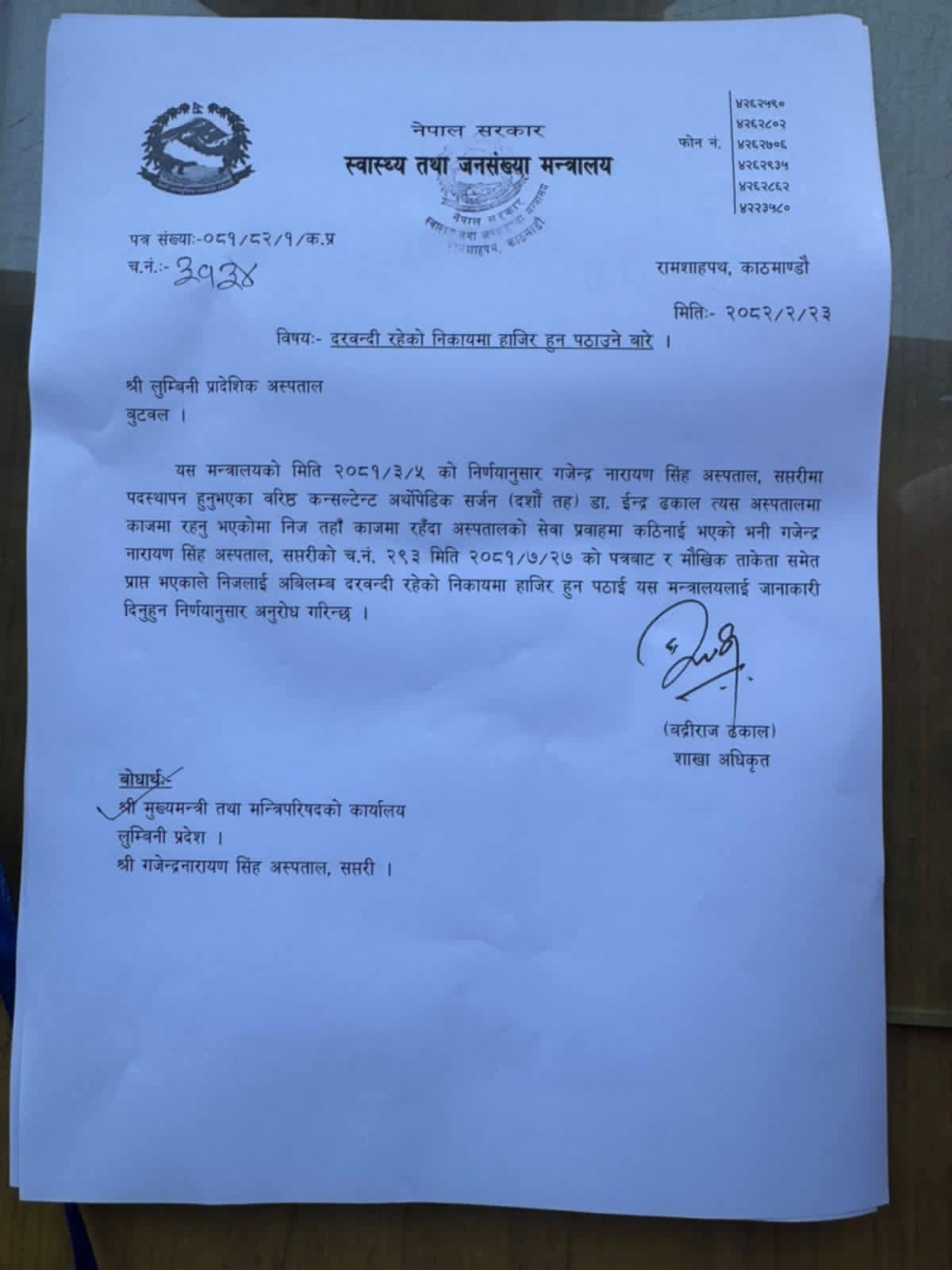 स्वास्थ्य मन्त्रालयले डा. ढकाललाई तुरुन्त दरबन्दी रहेको अस्पतालमा हाजिर हुन निर्देशन दिँदै लुम्बिनी प्रादेशिक अस्पताल र लुम्बिनी प्रदेशको मुख्यमन्त्री तथा मन्त्रिपरिषद् कार्यालयलाई बोधार्थ पत्र पठाएको छ । मन्त्रालयका शाखा अधिकृत बद्रीराज ढकालले जेठ २३ गते हस्ताक्षर गरेको पत्रमा स्पष्ट लेखिएको छ ।