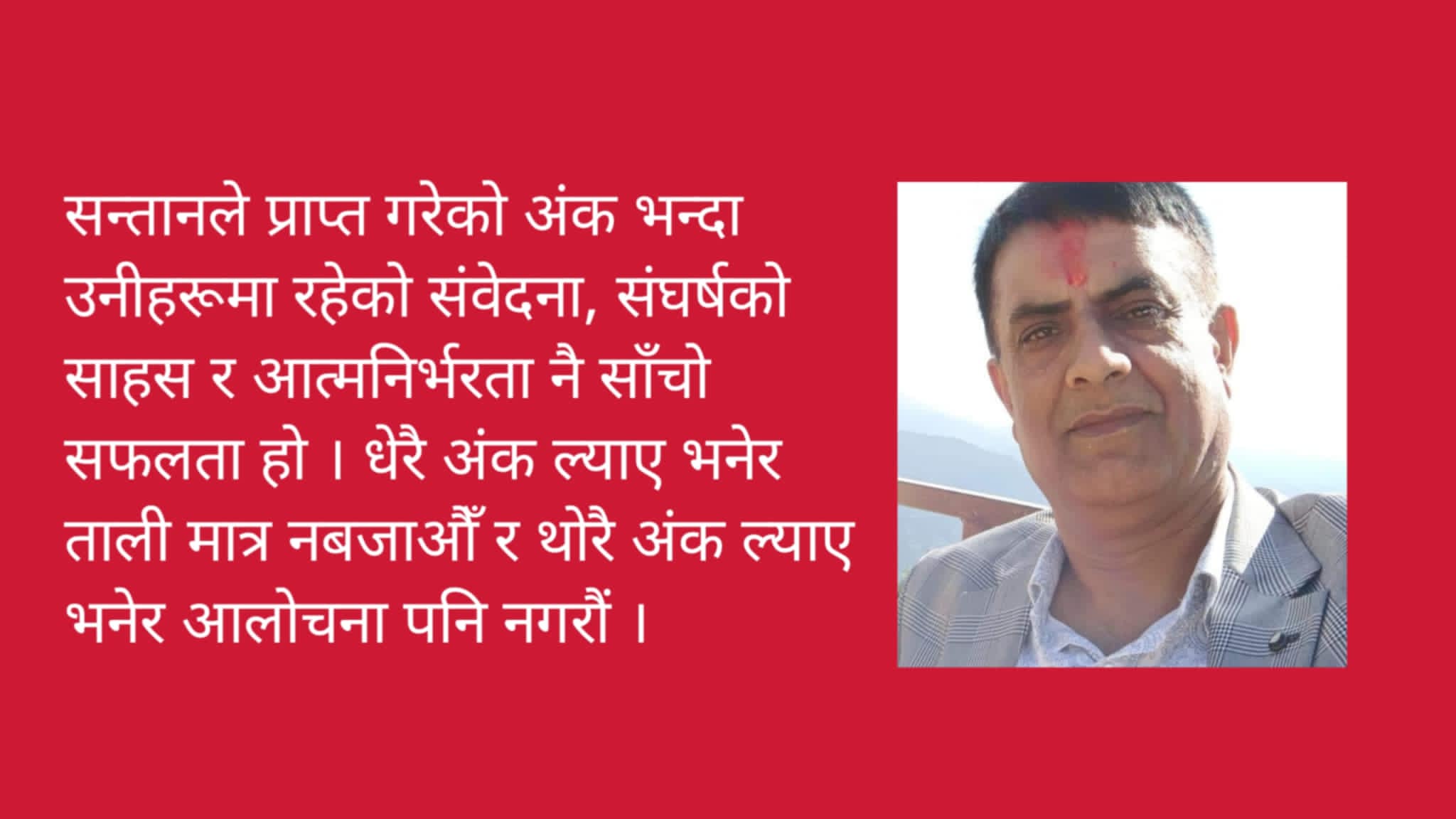 धेरै अंक ल्याए भनेर ताली मात्र नबजाऔँ र थोरै अंक ल्याए भनेर आलोचना पनि नगरौं । किनभने यो परिणाम जीवनको एउटा खुड्किलो मात्र हो, अन्तिम निष्कर्ष होइन ।