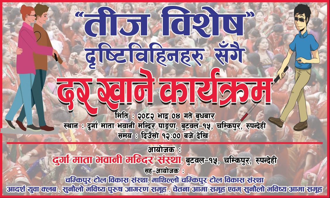 नजिकिँदै गरेको तीजको पूर्वसन्ध्यामा विभिन्न पार्टी प्यालेस र पार्कमा दर खुवाउने कार्यक्रम भइरहेका बेला क्लवले तीज विशेष दृष्टिबिहीनहरु सँगै दर दर खाने कार्यक्रमको आयोजना गरिएको क्लवका अध्यक्ष टीकाराम पन्थीले बताए । अध्यक्ष पन्थीले भने, हामीले दरसँगै तीजमा नयाँ लुगाको व्यवस्थाका लागि सफल युनिफर्म तिनकुनेबाट सर्ट पाइन्ट वितरण गरेका छौं, सहत्तरी थान कपडा प्रदान गरेका छौं, यसले उनीहरुमा खुसी ल्याउने विश्वास गरेको छु ।