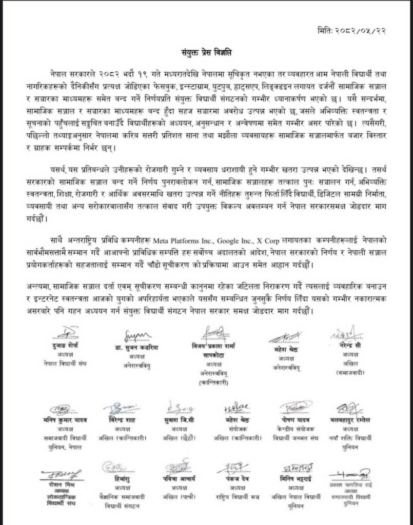 बुटवल, भदौ २३ गते । अखिल (छैठौं) सहितका १७ विद्यार्थी सङ्गठनले भदौ १९ गतेदेखि दर्ता नभएका सामाजिक सञ्जालमाथि रोक लगाउने निर्णयको विरोध गरेका छन् । २०८२ भदौ २२ गते आइतबार संयुक्त प्रेसविज्ञप्ति जारी गर्दै उनीहरूको सरकारको सो कदमको विरोध गरेका हुन् । सरकारको सो निर्णयले अभिव्यक्तिको स्वतन्त्रताका साथै विद्यार्थीको अध्ययन, अनुसन्धान र अन्वेषणमा समेत असर परेको उनीहरूको तर्क छ ।