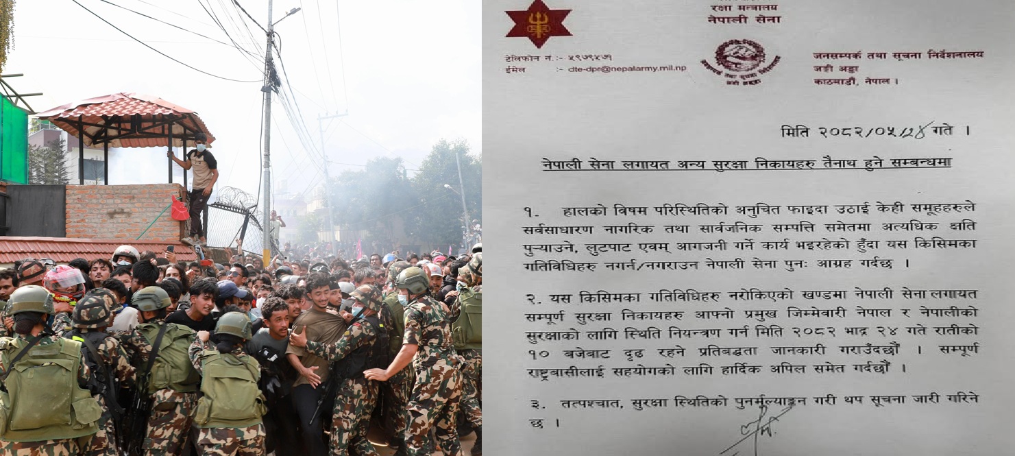 ‘हालको विषम परिस्थितिको अनुचित फाइदा उठाई केही समूहहरुले सर्वसाधारण नागरिक तथा सार्वजनिक सम्पत्ति समेतमा अत्यधिक क्षति पुऱ्याउने, लुटपाट एवम् आगजनी गर्ने कार्य भइरहेको हुँदा यस किसिमका गतिविधिहरु नगर्नरनगराउन नेपाली सेना पुनः आग्रह गर्दछ’, विज्ञप्तिमा लेखिएको छ, ‘यस किसिमका गतिविधिहरू नरोकिएको खण्डमा नेपाली सेना लगायत सम्पूर्ण सुरक्षा निकायहरु आफ्नो प्रमुख जिम्मेवारी नेपाल र नेपालीको सुरक्षाको लागि स्थिति नियन्त्रण गर्न मिति २०८२ भाद्र २४ गते रातीको १० बजेबाट दृढ रहने प्रतिबद्धता जानकारी गराउँदछौं ।