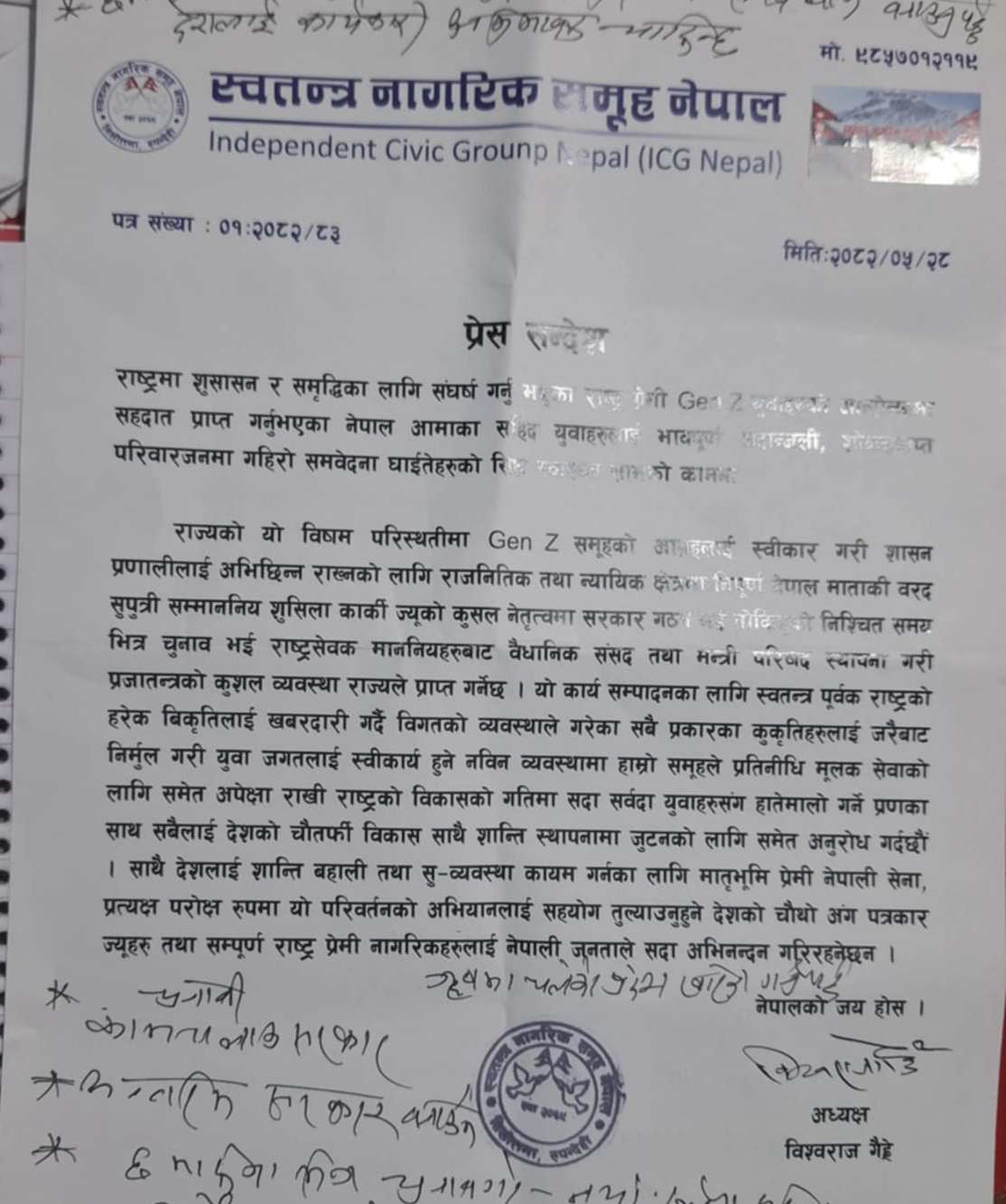 बुटवल, भदौ २८ गते । स्वतन्त्र नागरिक समूह नेपालले संसद विघटनलाई समर्थन र सरकारलाई स्वागत गर्दै समयमा निर्वाचन र संविधान संशोधन गर्न आग्रह गरेको छ । पुराना दलहरु असफल र भ्रष्टाचारी भएकाले जेनजी पुस्ताले ल्याएको परिवर्तन जनताको पक्षमा रहेको बताएको छ ।