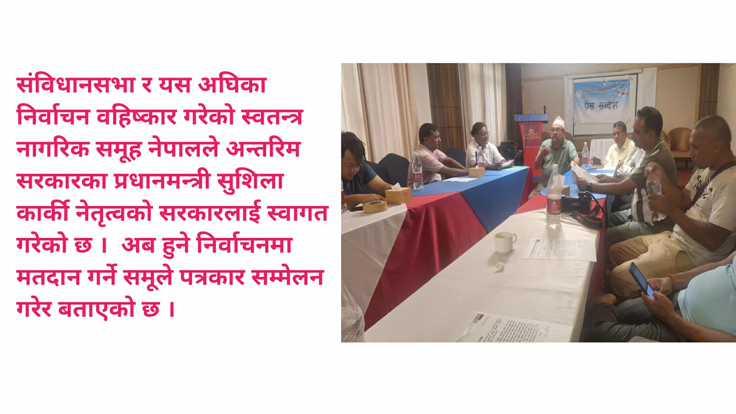 शनिबार सांझ रुपन्देहीमा पत्रकार सम्मेलन गरी स्वतन्त्र नागरिक समूह नेपालका अध्यक्ष विश्वराज गैह्ेले अन्तरिम सरकारका प्रधानमन्त्री शुसीला कार्कीलाई बधाइ ज्ञापन गर्दै घोषित मितिमा निर्वाचन र संविधान संसोधन गर्न सरकारलाई आग्रह गरेका छन् ।