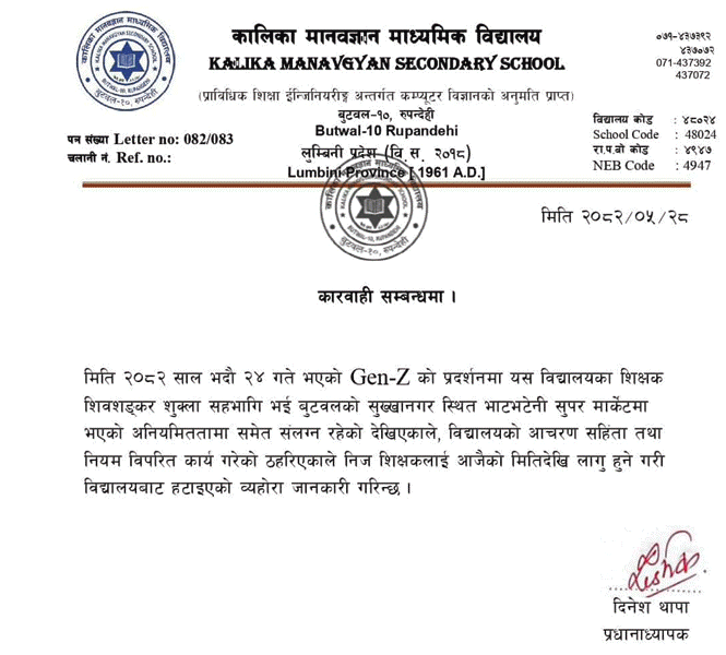 बुटवल, भदौ २८ गते । जेनजी आन्दोलनका क्रममा तोडफोड आगजनी र लुटपाटमा संलग्न रहेका बुटवलको कालिका मानवज्ञान माध्यमिक विद्यालयका शिक्षक विशशंकर शुक्लालाई निष्काशन गरिएको छ ।
