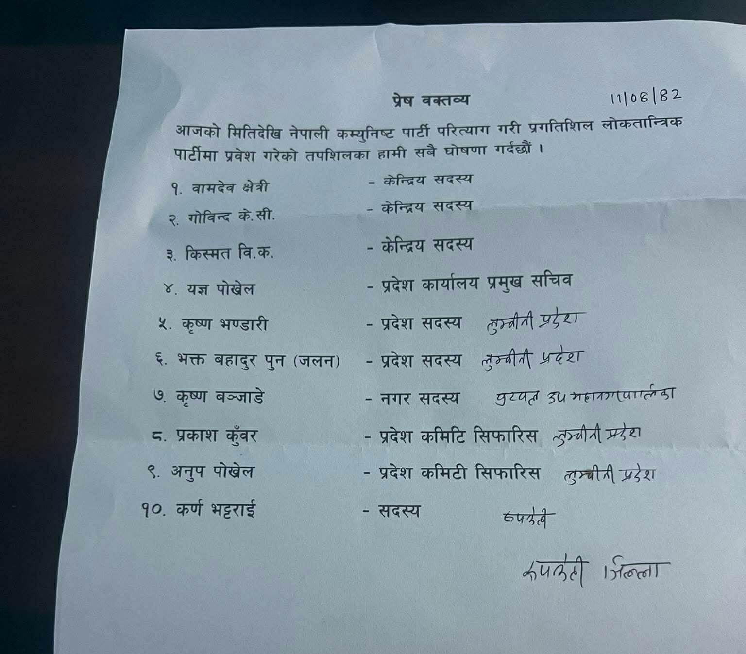 पुष्पकमल दाहाल प्रचण्ड संयोजक र माधवकुमार नेपाल सह–संयोजक रहेको नेपाली कम्युनिष्ट पार्टी छोडेको र आफुहरु प्रगतिशील लोकतान्त्रिक पार्टीमा आवद्द भएको विज्ञप्ती मार्फत उनीहरुले नाम सार्वजनिक गरेका छन् ।