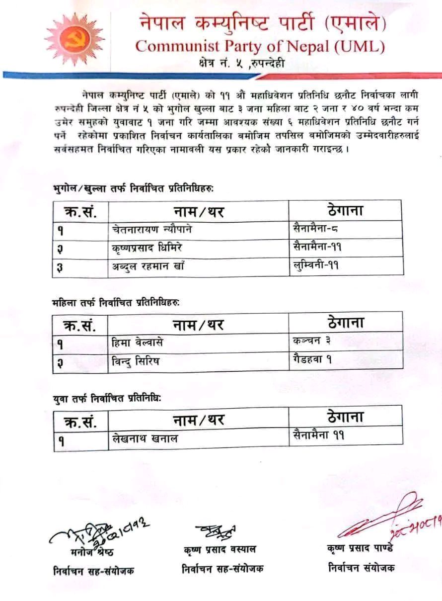 एमाले रुपन्देही २ मा १० र ५ मा ६ जना महाधिवेशन प्रतिनिधि निर्वाचित