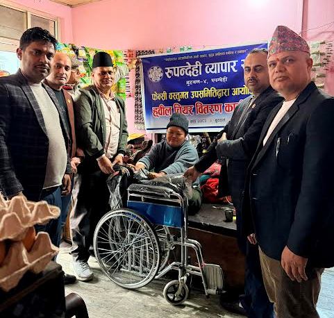 रुपन्देही व्यापार संघका अध्यक्ष प्रकाश ढकाल, फेन्सी बस्तुगत उपसमितिका संयोजक विष्णु भण्डारी, संघका कोषाध्यक्ष अर्जुन भट्राई, कार्यसमिति सदस्य बिजय ज्ञवाली र पे्रम नाथको टिम घरमै पुगेर ह्विल चियर प्रदान गरेको थियो ।