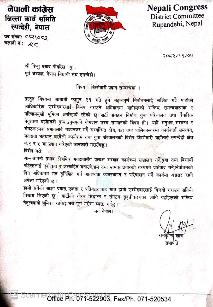 ंनेपाली कांग्रेस रुपन्देहीका जिल्ला सभापति रामकृष्ण खांणद्धारा जारी परिपत्रमा निर्वाचनमा उठाईएका कांग्रेसका उम्मेदवारलाई विजयी गराउन नेविसंघका पूर्व सभापतिहरुको सक्रिय, समन्वयात्मक र परिणामुखी भूमिका हार्य रहेको उल्लेख छ ।