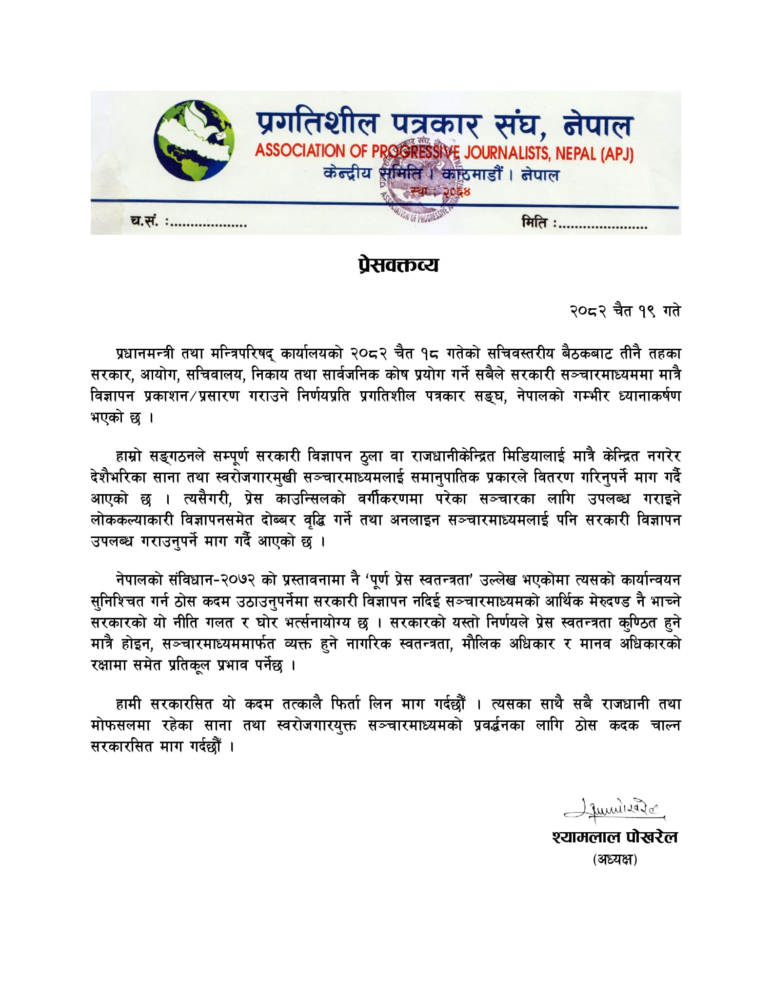 बिहीबार प्रगतिशील पत्रकार संघ नेपालका केन्द्रिय अध्यक्ष श्यामलाल पोखरेलले विज्ञप्ती जारी गरी नीजि क्षेत्रका मिडियालाई विज्ञापन रोक्ने सरकारको निर्णय गलत र स्वतन्त्र पे्रस बिरोधी भएको बताएका छन् ।