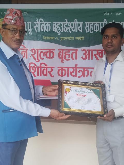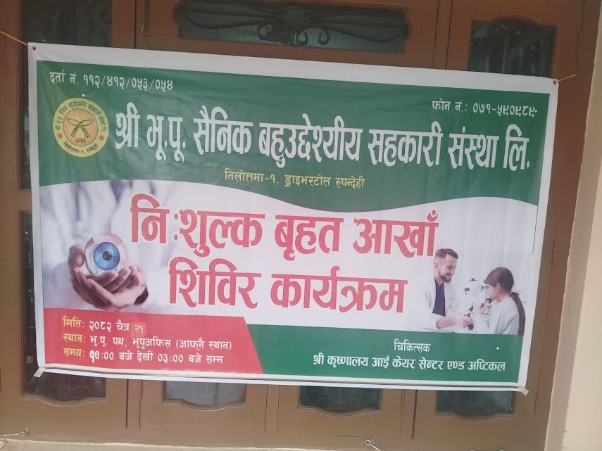 बुटवल, चैत २२ गते । रुपन्देहीको तिलोत्तमाको ड्राइभरटोलमा सञ्चालित भूपू सैनिक बहुउद्वेश्य सहकारीले निःशुल्क आंखा शिविर आयोजना गरेको छ । सहरकारीले सामाजिक उत्तरदायित्व अन्तरगत निःशुल्क आंखा शिविर आयोजना गरेको हो ।