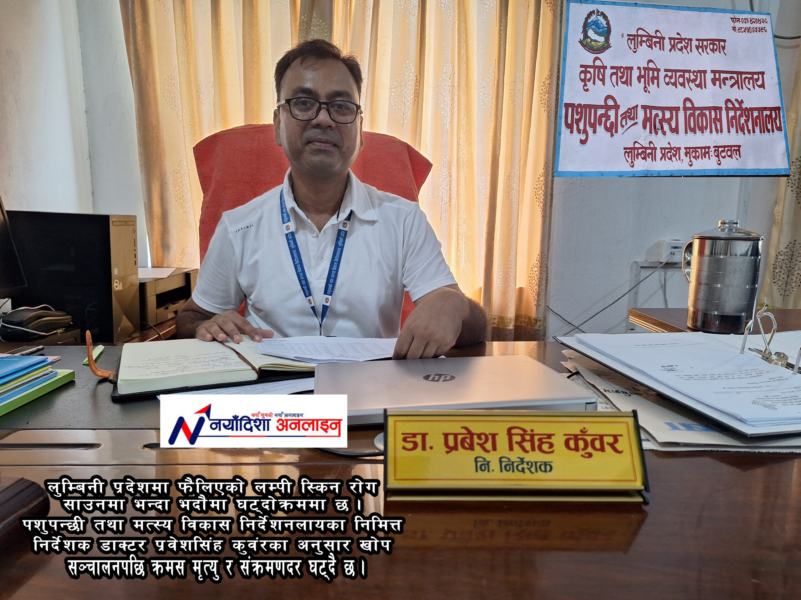 प्रकोपका रुपमा फैलिंदै लम्पी स्किन रोगविरुद्व सबै ठाउंमा खोपको व्यवस्था गरी पशु विज्ञ तथा चिकित्सकहरु खटाएर खोप लगाउन थालेपछि घट्दै गएको निमित्त निर्देशक कुवंरले बताए ।