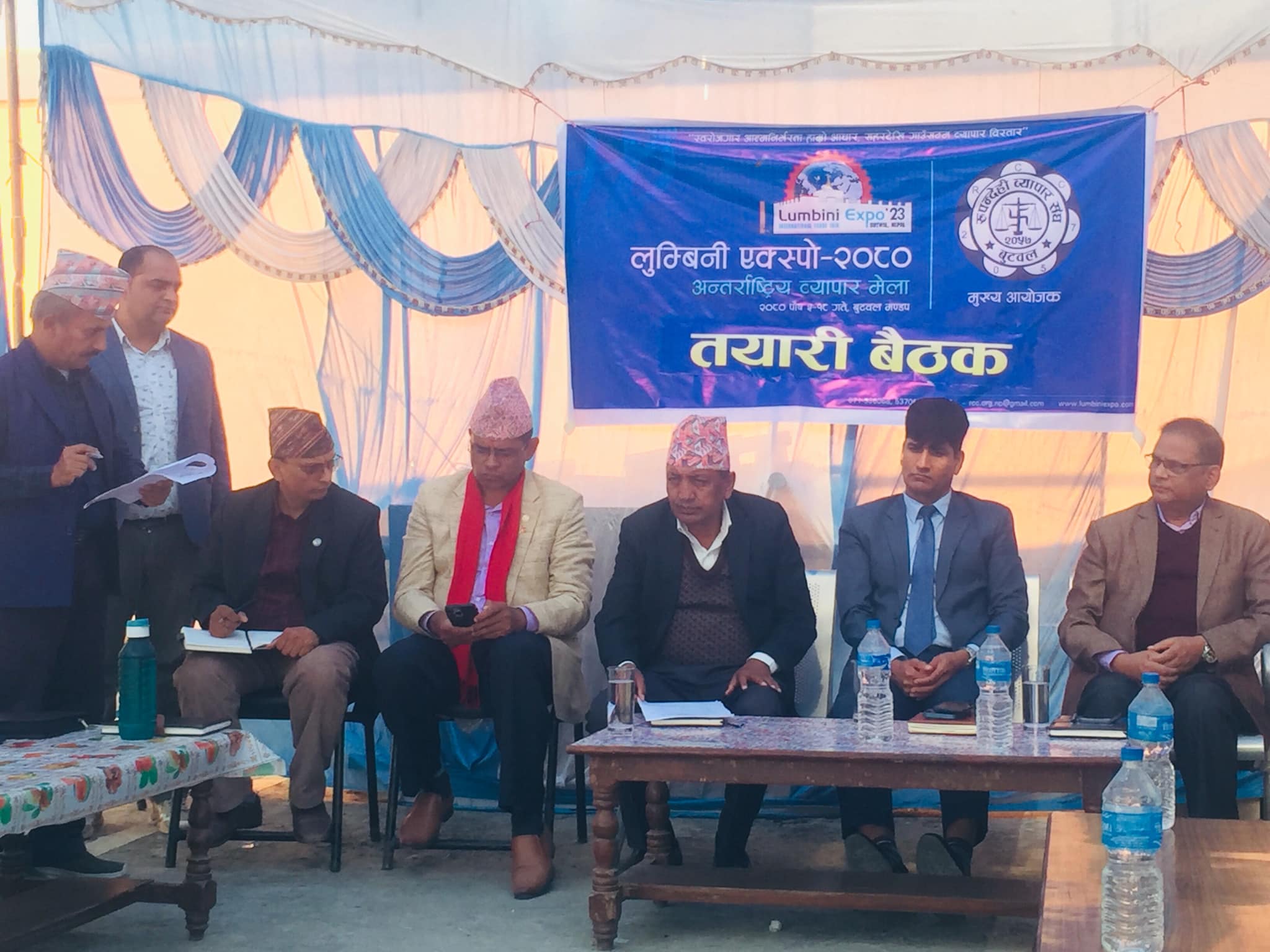 बुटवल/ रुपन्देही व्यापार संघको आयोजनामा आगामी पुष ५ गतेदेखि १८ गतेसम्म बुटवलमा हुन गैरहेको लुम्बिनी एक्स्पो २०८०, अन्तराष्ट्रिय व्यापार मेलाको तयारीको क्रममा सुरक्षा प्रवन्धका विषयमा सुरक्षा निकायका प्रमुखसंगको बैठक सम्पन्न भएको छ । बुधवार आयोजना स्थल बुटवलमण्डपमा आयोजना गरिएको मुल आयोजक समिति र सुरक्षा निकायका प्रमुखहरुसंगको संयुक्त बैठकले मेलालाई व्यवस्थित र सहज अवलोकनको प्रवन्ध मिलाउन सबैप्रकारका उपाय अवलम्बन गर्ने निर्णय गरेको छ ।