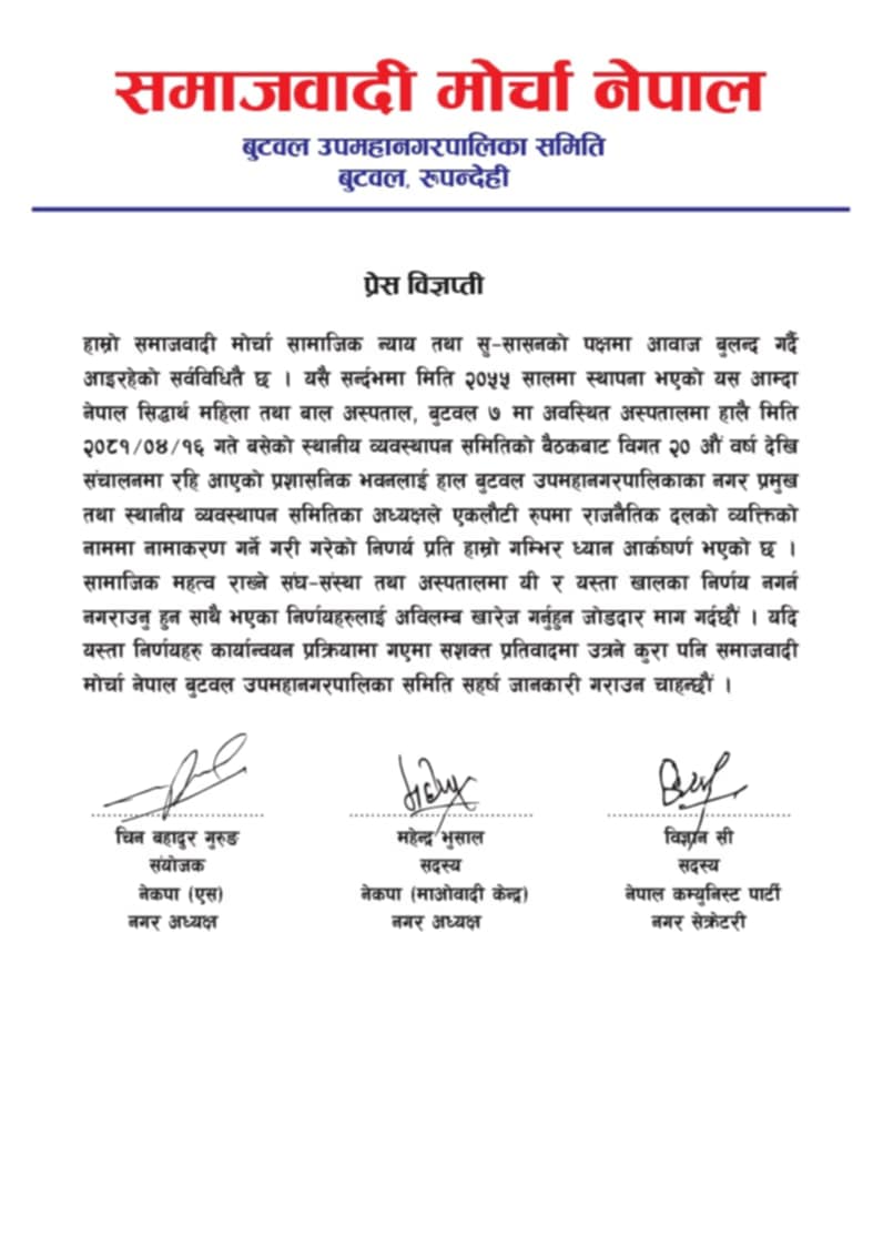 बुटवल, साउन २६ गते । समाजवादी मोर्चा नेपाल बुटवलले नेपाल सिद्दार्थ महिला तथा बाल अस्पताल व्यवस्थापन समितिको निर्णयको बिरोध गरेको छ ।