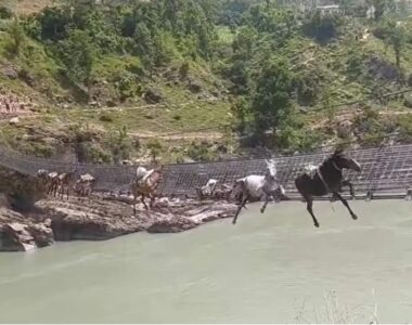 कर्णालीको झोलुंगे पुलको लट्ठा चुँडिदा खच्चड अड्किए