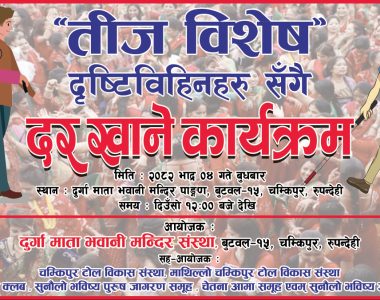 लायन्स क्लव बुटवल मणिमुकुन्दले दृष्टिविहीनलाई खुवायो दरबुटवल । हरितालिका तीजको अवसरमा लायन्स क्लव अफ बुटवल मणिमुकुन्दले दृष्टिबिहीनलाई दर खुवाएको छ । क्लवले फाउन्डेसनमा आश्रित दृष्टिबिहीनहरुलाई दर खुवाएको...पुरा पढ्नुहोस