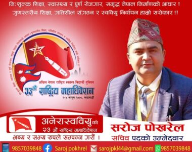 एमाले निकट अनेरास्ववियुको राष्ट्रिय सम्मेलन काठमाण्डौमा शुरु, बुटवलका सरोज पोखरेलको सचिवमा उम्मेदवारीबुटवल, फागुन २ गते । अखिल नेपाल राष्ट्रीय स्बतन्त्र बिद्यार्थी युनियन अनेरास्ववियुको २३ औ राष्ट्रिय महाधिबेशनको आज काठमाडौमा उद्घाटन भएको छ...पुरा पढ्नुहोस