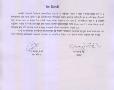 बुटवल , असोज २३ । रुपन्देहीको तिलोत्तमा नगरपालिका वडा नम्बर ८ निवासी सीता पौडेल र तिलोत्तमाको भलवारी माइती भएकी कपिलवस्तु निवासी...पुरा पढ्नुहोस