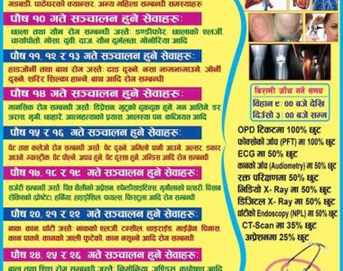 बुटवल,  पुस ४ गते । बुटवलको लुम्बिनी सिटी अस्पताल एण्ड मेडिकल सायन्स प्रालिले निःशुल्क स्वास्थ्य शिविरको आयोजना गरेको छ । स्वास्थ्य सेवा...पुरा पढ्नुहोस